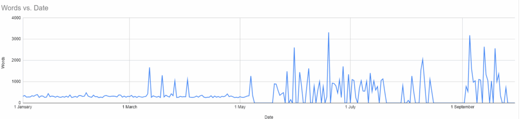 As I wrote in June, daily writing wasn’t working well for me … so I ditched the goal. And spoiler alert, I wrote a lot more. During July, August, and September, I wrote 44,843 words … and finished the rough draft of a new novel on Thursday 25th September.